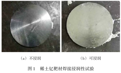 图1采用中φ100mm×8mm的稀土靶材测试焊料与靶材的浸润性,如图 1a 所示