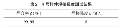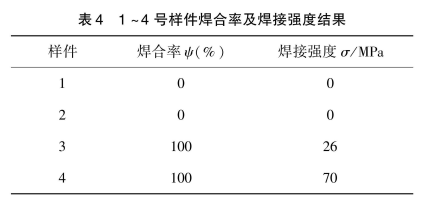 将扩散焊试样拆开包装,测试试样1~4的焊接率,制备焊接强度测试试样进行焊接强度测试。焊接率和煤接头强度数据见表4。