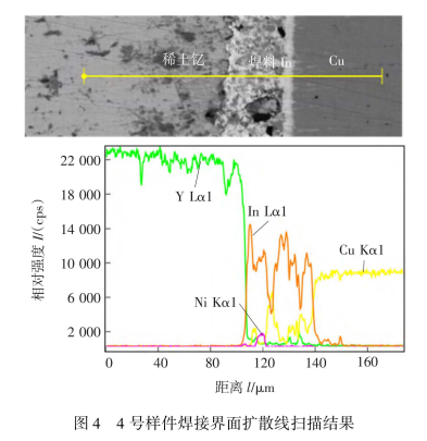 稀土钇材料具有较高的活性,有必要对焊接界面材料的反应进行分析。焊接试样沿直径方向取样,进行焊接界面分析,如图4所示。EDS能谱分析表明,稀土钇与In焊料之间没有明显的反应污染,这是由于稀土与In焊料之间的金属化Ni层起到了隔离稀土与In焊料的阻挡层的作用。