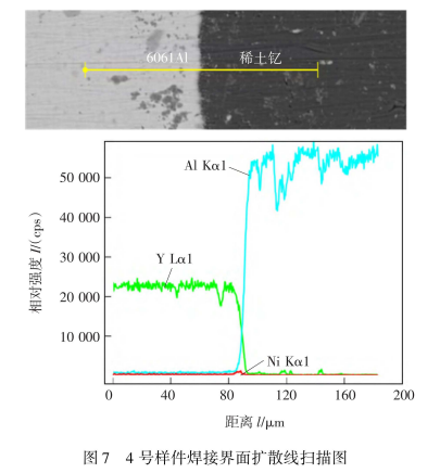 3号和4号扩散焊试样沿直径方向取样作为焊接界面分析试样,3号和4号焊接界面的线扫描成分分析结果如图所示。6和图7用能谱仪。